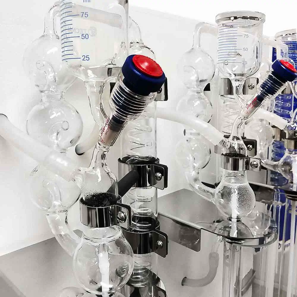 Vidrierías: Tres Conexiones tipo Kjeldahl con vaso dosificador en vidrio de borosilicato en la parte frontal y válvula Stop-flow
