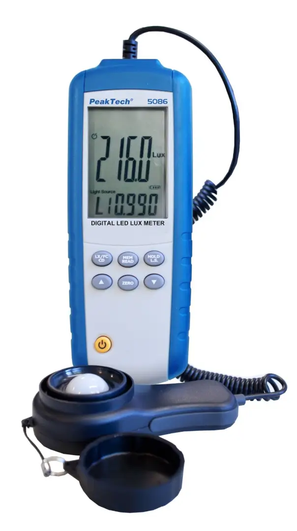 Este medidor de lux LED con pantalla LCD de 3 3/4 dígitos (máx. 3999) es un dispositivo de medición preciso, ideal para medir la iluminancia de luces LED, lámparas fluorescentes o lámparas de filamento convencionales con diferentes colores de luz. La medición se realiza en lux (lx), pies bujías (fc) o candelas (cd). Los luxómetros simples suelen utilizarse solo para medir luz estándar; por ejemplo, las lámparas de filamento con una temperatura de color de 2856 K son adecuadas, pero ofrecen resultados de medición imprecisos a diferentes temperaturas de color. Con el PeakTech 5086, se pueden configurar diferentes factores de fuente de luz, por ejemplo, para medir diferentes lámparas de neón, lámparas de filamento, LED rojos, azules, amarillos o de luz diurna. El dispositivo cuenta con 10 factores de corrección libremente ajustables para diversas fuentes de luz, 99 memorias para valores medidos y otras funciones de medición útiles, como la función de valor mínimo y máximo o la retención de datos, lo que lo hace ideal para uso profesional en seguridad laboral o para la evaluación de sistemas de iluminación.