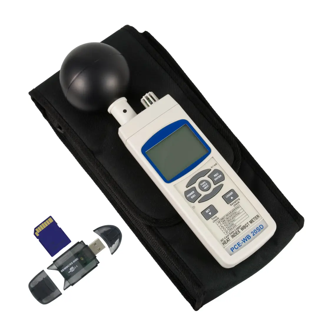 Medidor profesional para evaluación del estrés térmico y documentación de condiciones ambientales en el lugar de trabajo. Mide el índice WBGT para interior y exterior, además de temperatura de globo negro, temperatura del aire, humedad, temperatura de bulbo húmedo y punto de rocío. Integra registrador de datos con almacenamiento en tarjeta SD y lectura directa en PC mediante hoja de cálculo, ideal para protocolos de seguridad e higiene ocupacional, actividades al aire libre y control de pausas/restricciones por calor. Incluye alarma acústica ante cambios de condición y visualización en pantalla LCD retroiluminada.
